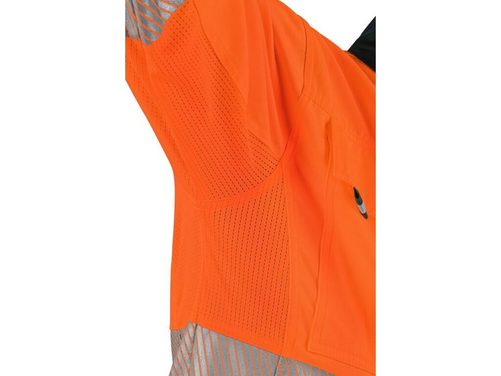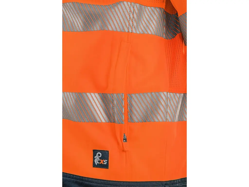 Pánská výstražná blůza CXS HALIFAX je určena pro práci v letním období. Je vybavena segmentovanými reflexními pásky o šířce 5 cm, které zajišťují vysokou viditelnost a přitom zachovávají pružnost materiálu. Blůza má zapínání na zip, které je kryté klopou s kovovými druky. Je vybavena náprsními kapsami s klopou na suchý zip a skrytými kapsami na zip, a také bočními kapsami na zip. Manžety rukávů a spodní lem lze jednoduše utáhnout pomocí suchého zipu. V podpaží a na zádech je použit síťovaný materiál pro lepší mikrocirkulaci vzduchu a odvod tepla. V kombinaci s kalhotami nebo kalhotami s náprsenkou blůza CXS HALIFAX splňuje ochrannou kategorii 3 dle EN ISO 20471. Doporučené použití: letní pracovní oděv, stavebnictví, silniční práce, logistika, údržba, řidiči, letecká a lodní doprava, záchranáři či technické služby.