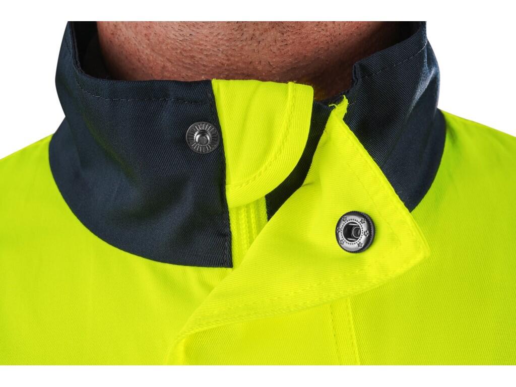 Pánská výstražná blůza CXS HALIFAX je určena pro práci v letním období. Je vybavena segmentovanými reflexními pásky o šířce 5 cm, které zajišťují vysokou viditelnost a přitom zachovávají pružnost materiálu. Blůza má zapínání na zip, které je kryté klopou s kovovými druky. Je vybavena náprsními kapsami s klopou na suchý zip a skrytými kapsami na zip, a také bočními kapsami na zip. Manžety rukávů a spodní lem lze jednoduše utáhnout pomocí suchého zipu. V podpaží a na zádech je použit síťovaný materiál pro lepší mikrocirkulaci vzduchu a odvod tepla. V kombinaci s kalhotami nebo kalhotami s náprsenkou blůza CXS HALIFAX splňuje ochrannou kategorii 3 dle EN ISO 20471. Doporučené použití: letní pracovní oděv, stavebnictví, silniční práce, logistika, údržba, řidiči, letecká a lodní doprava, záchranáři či technické služby.