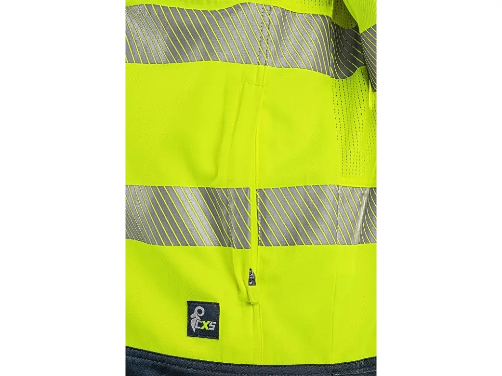 Pánská výstražná blůza CXS HALIFAX je určena pro práci v letním období. Je vybavena segmentovanými reflexními pásky o šířce 5 cm, které zajišťují vysokou viditelnost a přitom zachovávají pružnost materiálu. Blůza má zapínání na zip, které je kryté klopou s kovovými druky. Je vybavena náprsními kapsami s klopou na suchý zip a skrytými kapsami na zip, a také bočními kapsami na zip. Manžety rukávů a spodní lem lze jednoduše utáhnout pomocí suchého zipu. V podpaží a na zádech je použit síťovaný materiál pro lepší mikrocirkulaci vzduchu a odvod tepla. V kombinaci s kalhotami nebo kalhotami s náprsenkou blůza CXS HALIFAX splňuje ochrannou kategorii 3 dle EN ISO 20471. Doporučené použití: letní pracovní oděv, stavebnictví, silniční práce, logistika, údržba, řidiči, letecká a lodní doprava, záchranáři či technické služby.