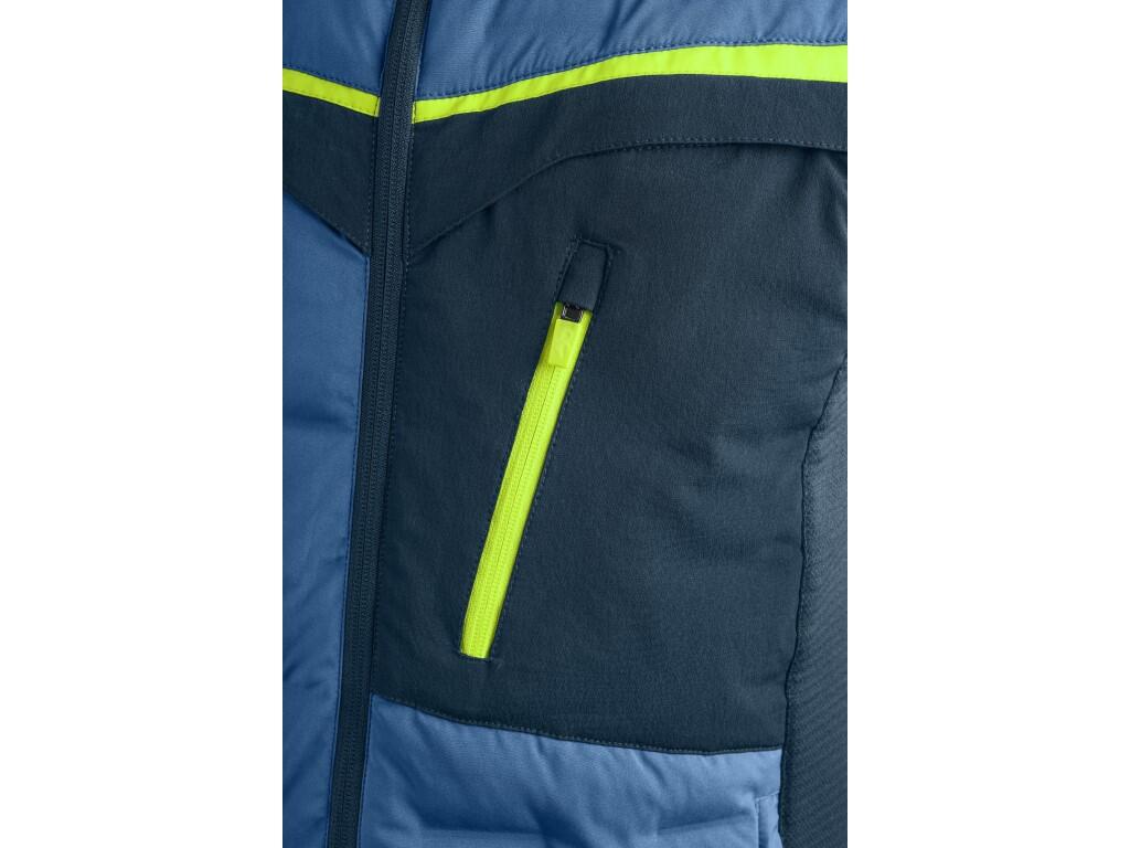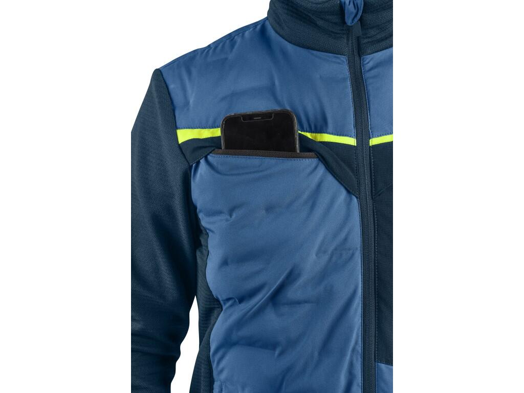 Pánská hybridní bunda CXS NAOS je vhodná do práce i pro volnočasové aktivity. Hrudník, záda a ramena jsou zatepleny výplní z vlákna Sorona®, které má vynikající termoizolační vlastnosti. Rukávy, boky a límec z prodyšného úpletu neomezují v pohybu a zajišťují optimální komfort při nošení. Praktické kapsy na zip poskytují dostatek úložného prostoru – dvě boční, tři náprsní a vnitřní kapsa na zip. V pravé náprsní kapse se nachází odnímatelné pouzdro na ID kartu. Stahování v dolním okraji umožňuje přizpůsobit velikost postavě, čímž přináší dodatečnou tepelnou izolaci. Bunda je vybavena kontrastními a reflexními prvky, které zvyšují bezpečnost v prostředí se zhoršenou viditelností.