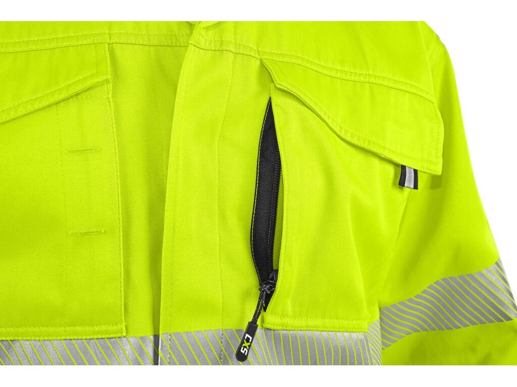 Men’s hi-vis jacket with segmented reflective tapes (5 cm wide). Durable twill weave ensures high strength and wear resistance. The jacket features covered front fastening with plastic buttons, chest pockets with flap and velcro – the left pocket includes a hidden zip pocket, the right one has a smaller pencil pocket. Side pockets and plastic-buttoned sleeve cuffs add to the practicality. Recommended use: construction, road workers, drivers, maintenance, logistics, aviation and shipping, garbage collectors, rescuers.