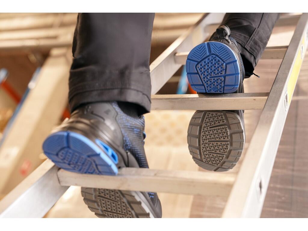Work low-cut shoe with LG (Ladder Grip) outsole certified for use on ladders. The upper is made of lightweight knit with TPU elements, offering excellent breathability, durability, and protection against water penetration and absorption. The heel is reinforced with rubber for increased durability and protection. The shoe is metal free – completely free of metal components. The breathable mesh lining made of polyester and microfiber resists abrasion. Reflective elements enhance safety in low-light conditions. The HI-POLY insole provides all-day comfort. The outsole features a special midfoot design for improved stability while working. The PU/rubber compound is oil-resistant, slip-resistant, antistatic, and absorbs energy in the heel area.