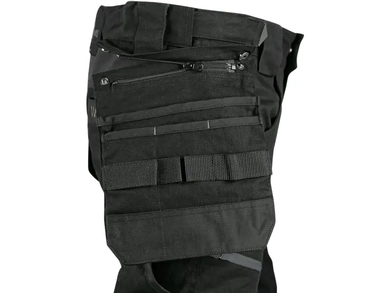 Men’s work trousers in a modern slim-fit cut. The combination of high-quality blend material with elastane and 4-way stretch construction in exposed areas allows easy and comfortable movement. The trousers are equipped with flexible waist with adjustable size and belt loops, inner waist with antislip rubber printing, 2 front pockets, 2 removable tool pockets reinforced with CORDURA®, thigh zipper pockets with possibility of ventilation, side pocket with zipper pocket, 2 back pockets (one with zipper) reinforced with CORDURA®, folding ruler pocket with other pockets, ergonomic knees reinforced with CORDURA® with side opening for knee pads and ventilation, ID card holder, leg bottom reinforced with CORDURA®, reflective accessories. The trousers are equipped with the EASY-PROLONG system, which allows for easy length extension by releasing the seam on the legs, making them suitable for taller individuals. Recommended application: engineering, construction, light industry, automotive, logistics, warehouse, spedition, car services, maintenance, assembly, agriculture, gardening, hobby and leisure.