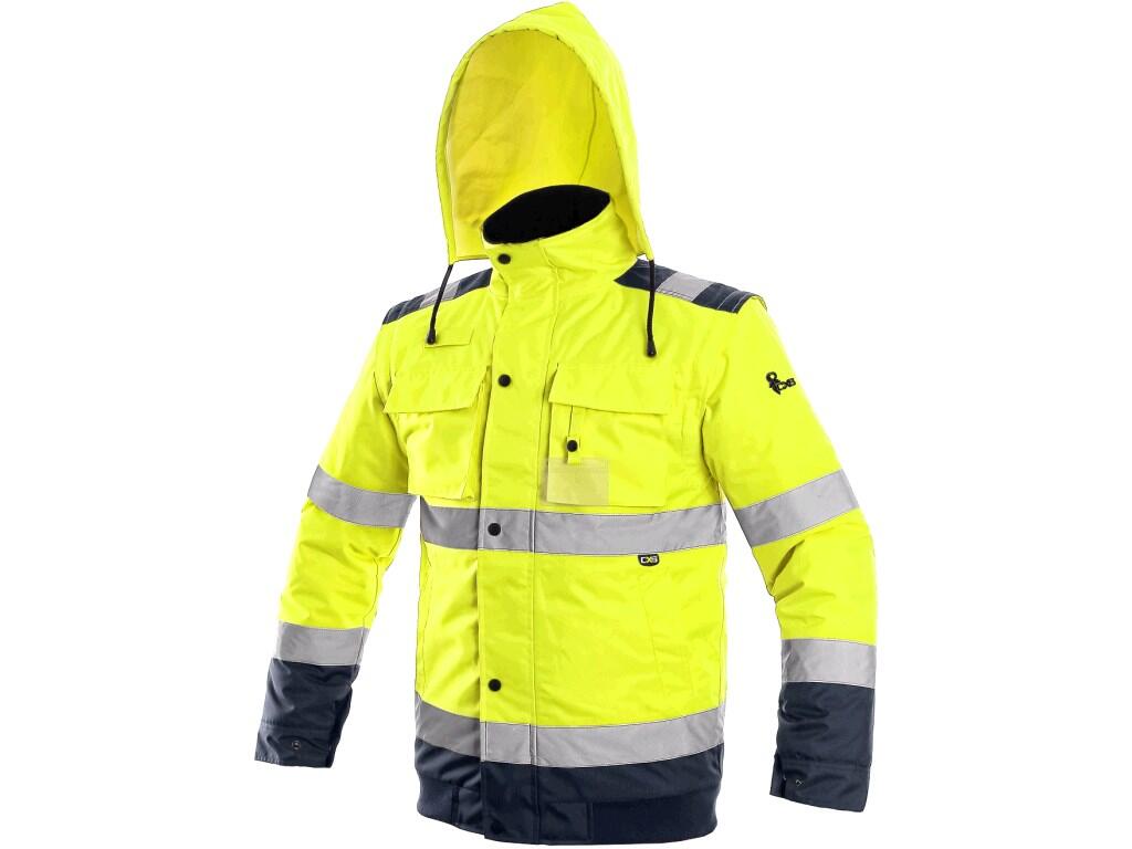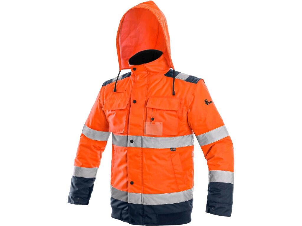 Men’s high visible padded jacket to the waist, 2 in 1, water-resistant and windproof, reflective tapes, taped seams, zipper fastening covered by trimming, removable sleeves with regulated and inner wristband, hood in the collar, inner fleece collar, elastic waist, 2 bottom pockets, 2 breast flap pockets with velcro, loop for an ID card on the left side, loop on the radio on the right side, 1 inner pocket. Zipper inside for easier placing of embroidery on the outside of the jacket. Recommended application: construction, road workers, drivers, logistics, maintenance, garbage collectors, rescuers, work in winter and humid environment, laborers.
