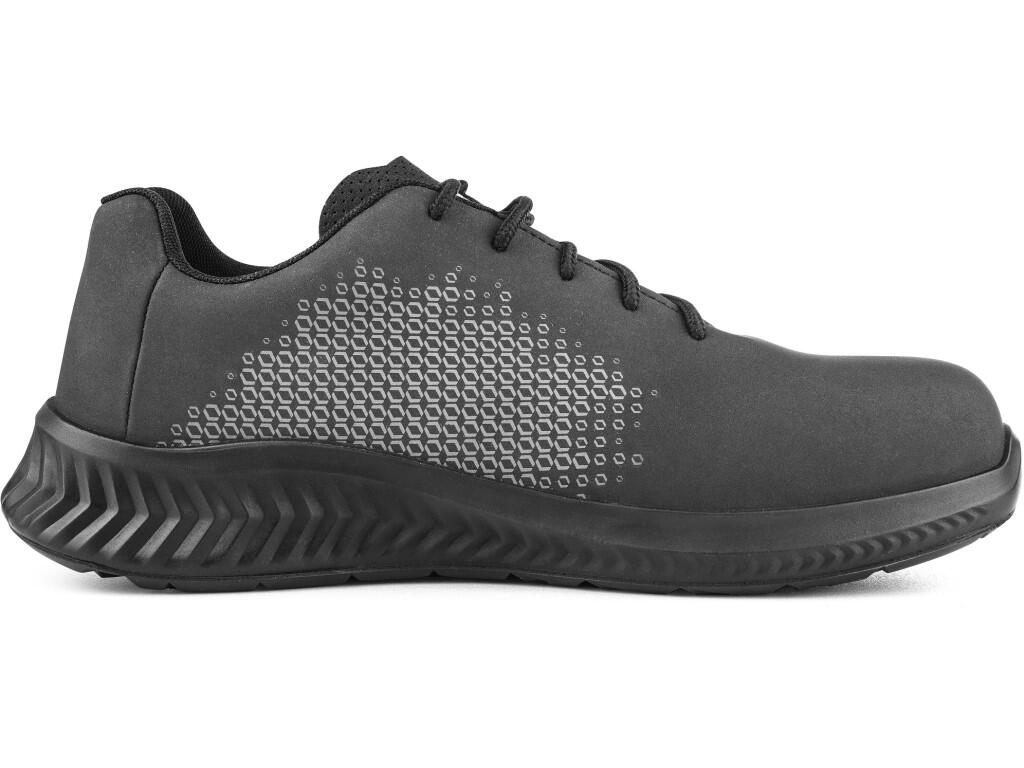 Bezpečnostní polobotka, kožená, s plastovou špicí a kevlarovou stélkou, reflexní doplňky. Materiál: svršek z 1,6 – 1,8 mm štípenkové nubukové kůže (z jednoho dílu), vnější TPU ochrana paty, bez kovových součástí, podšívka z prodyšné oděru odolné text