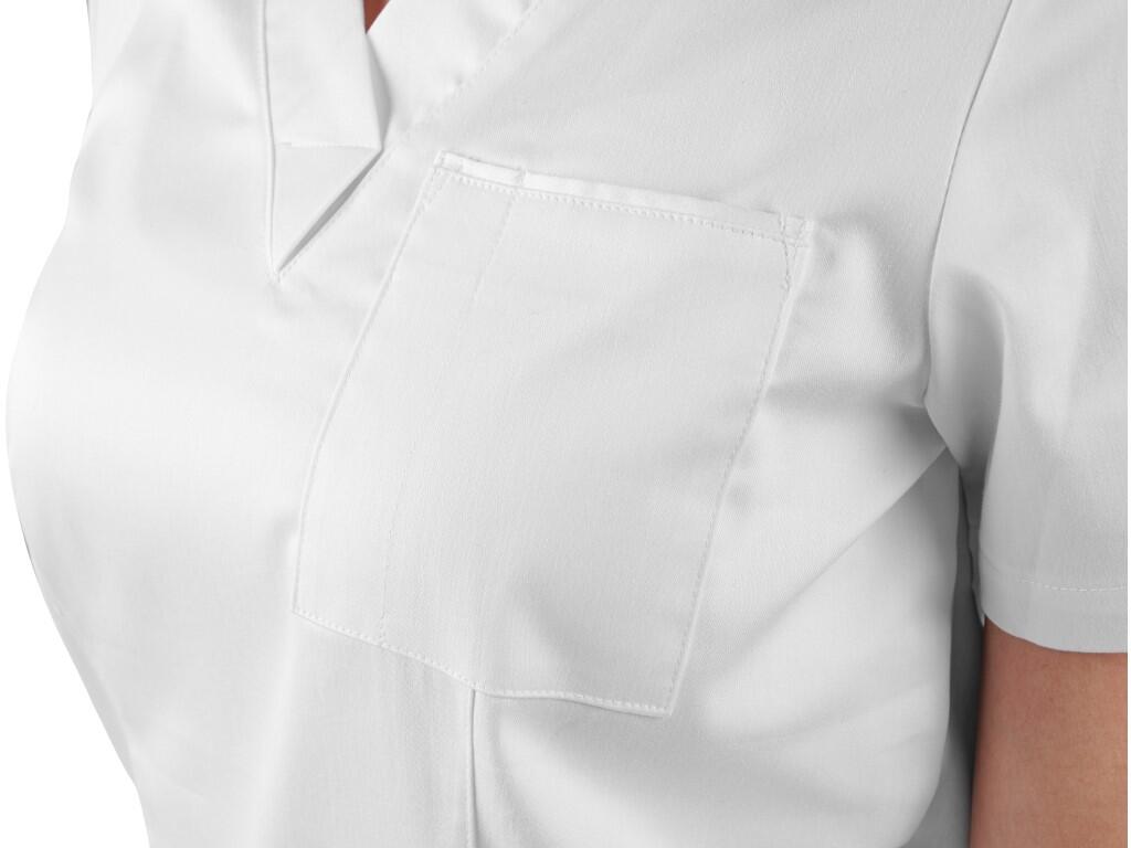 Wygodna bluza damska. Kieszeń na piersi z mniejszą kieszenią na ołówek, 2 dolne kieszenie. Zalecane zastosowanie: prywatne gabinety lekarskie, kliniki i różne placówki medyczne, pogotowie ratunkowe, uzdrowiska i kąpiele, instytucje opieki społecznej, apteki, szkoły o profilu medycznym.
