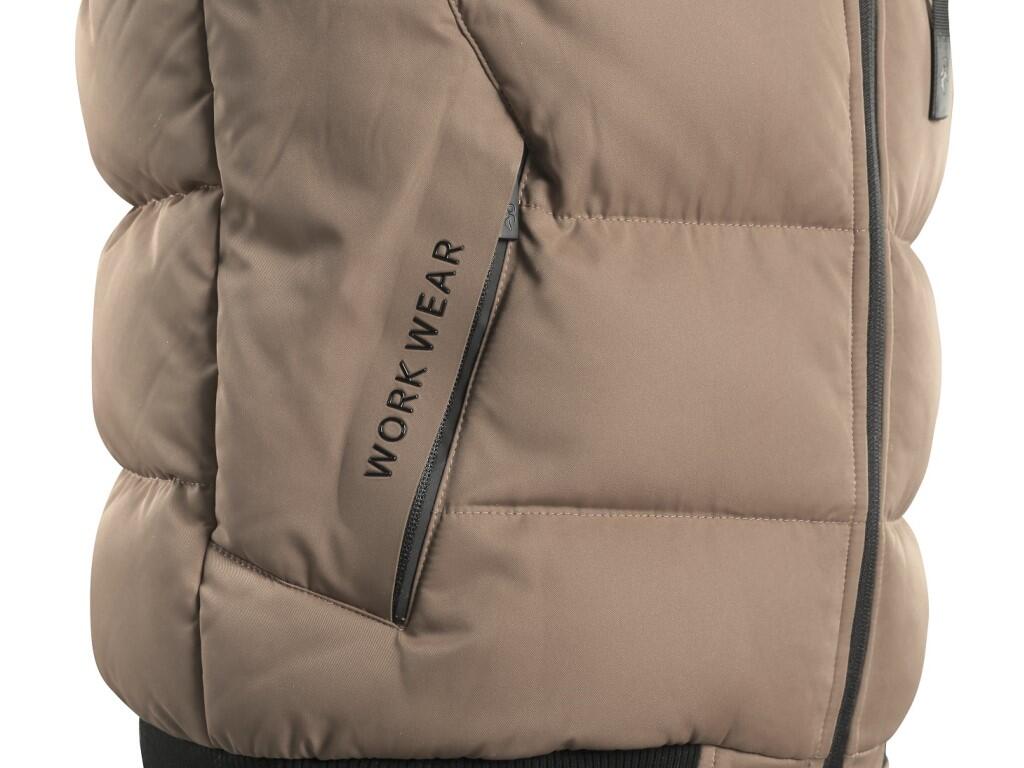 Męska zimowa kamizelka do pracy i na czas wolny. Dzięki nowoczesnemu pikowanemu designowi z ciepłym ociepleniem zapewnia komfort i styl. Kamizelka jest wyposażona w odpinany kaptur z dzianiny, boczne kieszenie na zamek z elementami odblaskowymi oraz wewnętrzną kieszeń na zamek. Pas wykonany jest z elastycznego ściągacza, który dobrze przylega do ciała.