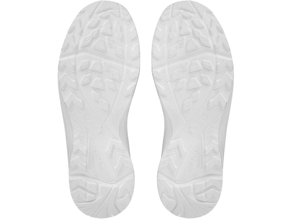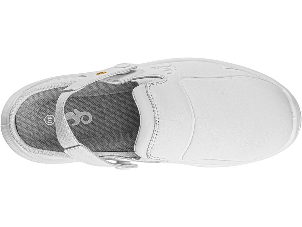Biały klapek z regulowanym paskiem na pięcie, właściwościami ESD i antybakteryjną powłoką Sanitized. Materiał: cholewka z gładkiej mikrofibry, łatwej w utrzymaniu. Podszewka z oddychającej siateczki oraz wytrzymałej mikrofibry. Wkładka: komfortowa HI-POLY. Podeszwa: PU, antystatyczna, odporna na oleje, antypoślizgowa.