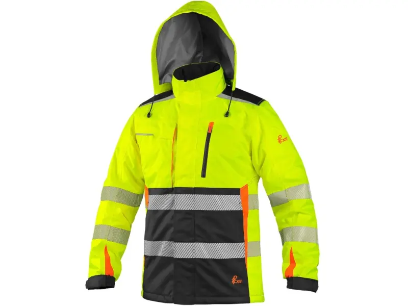 Pánská výstražná zateplená bunda s odepínací kapucí, odolná proti vodě a větru. Fleecový límec, větrání v podpaží, regulovatelné manžety na rukávech, vnitřní manžety v rukávech, kryté zapínání na zip a druky, náprsní a boční kapsy na zip, v pravé náp