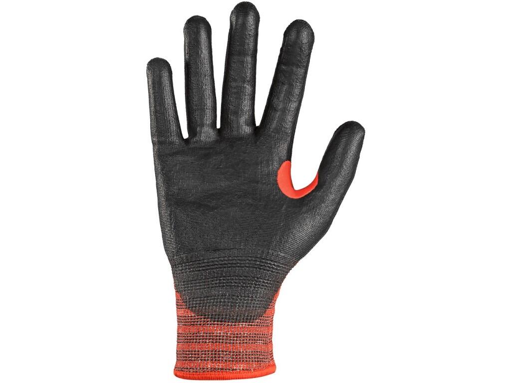Protiřezné ESD rukavice s odolností proti řezu F a antistatickými a ESD vlastnostmi. Vnitřní odpor – výsledek: Rv<1,0 x 108 Ω. Dlaň a prsty povrstveny polyuretanem. Podklad tvoří bezešvý úplet bez obsahu skelných nebo ocelových vláken. Funkce Touchscreen (možnost ovládat dotykové obrazovky) je podmíněna volbou vhodné velikosti rukavice. Rukavice jsou pratelné, čímž snižují spotřebu a tím vznik odpadu. Neobsahují silikon. Doporučené aplikace: EPA prostory, elektrotechnický průmysl, obsluha CNC strojů a robotů, logistika, skladování, manipulace s tabulovým sklem a předměty s ostrými hranami, manipulace s tabulovým plechem, řezání suchých, lakovaných nebo galvanizovaných dílů, řezání malých, suchých nebo lehce zaolejovaných dílů, údržba.