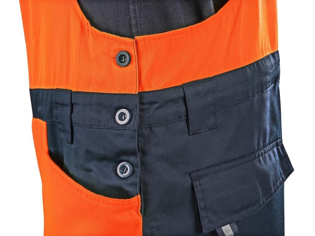 Pánské výstražné kalhoty s náprsenkou CXS HALIFAX jsou určeny pro práci v letním období. Jsou vybaveny segmentovanými reflexními pásky o šířce 8 cm, které zajišťují vysokou viditelnost a přitom zachovávají pružnost materiálu. Regulovatelné šle s gumou v zadní části umožňují volný pohyb a pohodlné nošení. Kalhoty mají pas s poutky na opasek a bočním zapínáním na knoflíky, kryté zapínání na zip a řadu praktických kapes – náprsní kapsu na zip, dvě přední kapsy, dvě zadní kapsy s klopou na suchý zip a pravou boční kapsu na zip. Zdvojená kolena zvyšují odolnost a umožňují vložení kolenních výztuh pro vyšší komfort při práci v kleče. Na vnitřní straně stehen a zadní části kolen je použit síťovaný materiál pro lepší mikrocirkulaci vzduchu a odvod tepla. V kombinaci s blůzou CXS HALIFAX splňují ochrannou kategorii 3 dle EN ISO 20471. EASY-PROLONG systém umožňuje prodloužení délky nohavic na vyšší postavu, a to uvolněním švu na nohavicích. Doporučené použití: letní pracovní oděv, stavebnictví, silniční práce, logistika, údržba, řidiči, letecká a lodní doprava, záchranáři či technické služby.
