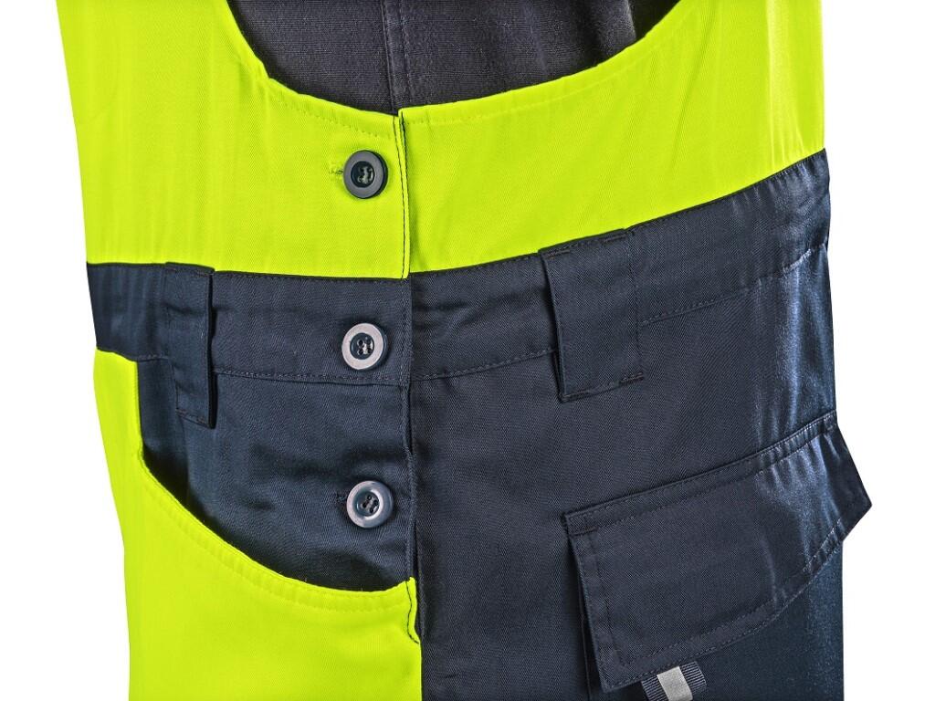 Pánské výstražné kalhoty s náprsenkou CXS HALIFAX jsou určeny pro práci v letním období. Jsou vybaveny segmentovanými reflexními pásky o šířce 8 cm, které zajišťují vysokou viditelnost a přitom zachovávají pružnost materiálu. Regulovatelné šle s gumou v zadní části umožňují volný pohyb a pohodlné nošení. Kalhoty mají pas s poutky na opasek a bočním zapínáním na knoflíky, kryté zapínání na zip a řadu praktických kapes – náprsní kapsu na zip, dvě přední kapsy, dvě zadní kapsy s klopou na suchý zip a pravou boční kapsu na zip. Zdvojená kolena zvyšují odolnost a umožňují vložení kolenních výztuh pro vyšší komfort při práci v kleče. Na vnitřní straně stehen a zadní části kolen je použit síťovaný materiál pro lepší mikrocirkulaci vzduchu a odvod tepla. V kombinaci s blůzou CXS HALIFAX splňují ochrannou kategorii 3 dle EN ISO 20471. EASY-PROLONG systém umožňuje prodloužení délky nohavic na vyšší postavu, a to uvolněním švu na nohavicích. Doporučené použití: letní pracovní oděv, stavebnictví, silniční práce, logistika, údržba, řidiči, letecká a lodní doprava, záchranáři či technické služby.
